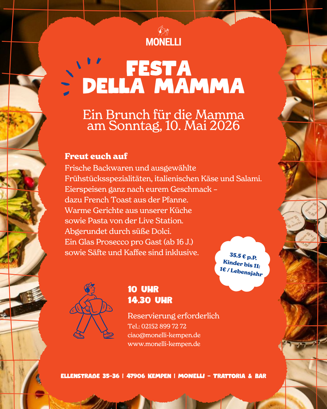 Frische Backwaren, ausgewählte Frühstücksspezialitäten, italienischer Käse und Salami. Eierspeisen, French Toast sowie Spiegeleier und Omeletts – frisch zubereitet. Danach wird’s herzhafter: warme Gerichte aus unserer Küche und Pasta von der Live-Station, frisch gekocht mit verschiedenen Saucen – von klassisch bis besonders. Abgerundet wird das Ganze durch eine Auswahl an süßen Dolci. Ein Glas Prosecco pro Gast (ab 16 J.) sowie Säfte und Kaffee sind inklusive.